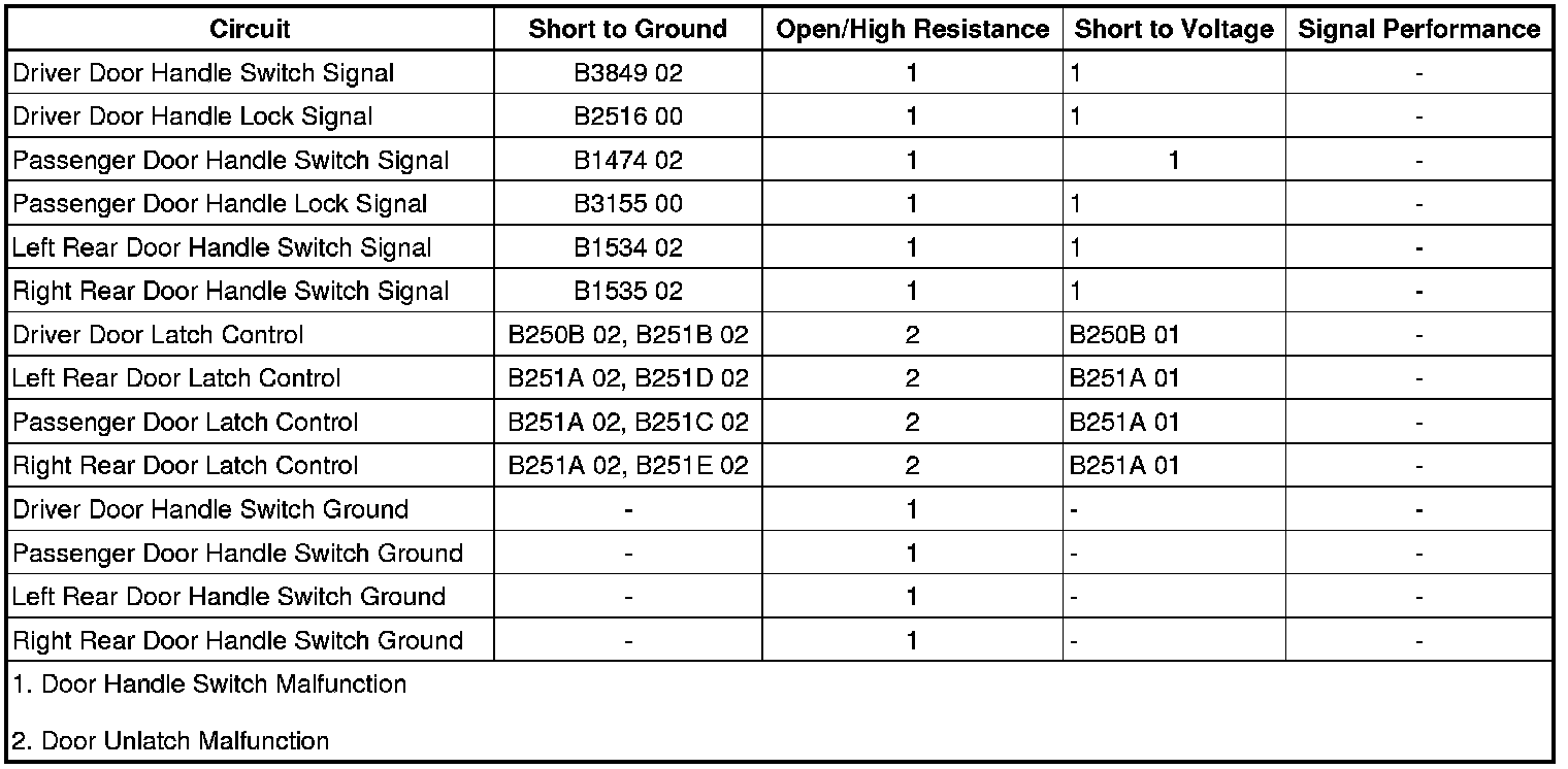 • If a single door does not perform as specified, refer to Passenger or Rear Door Latch Malfunction.