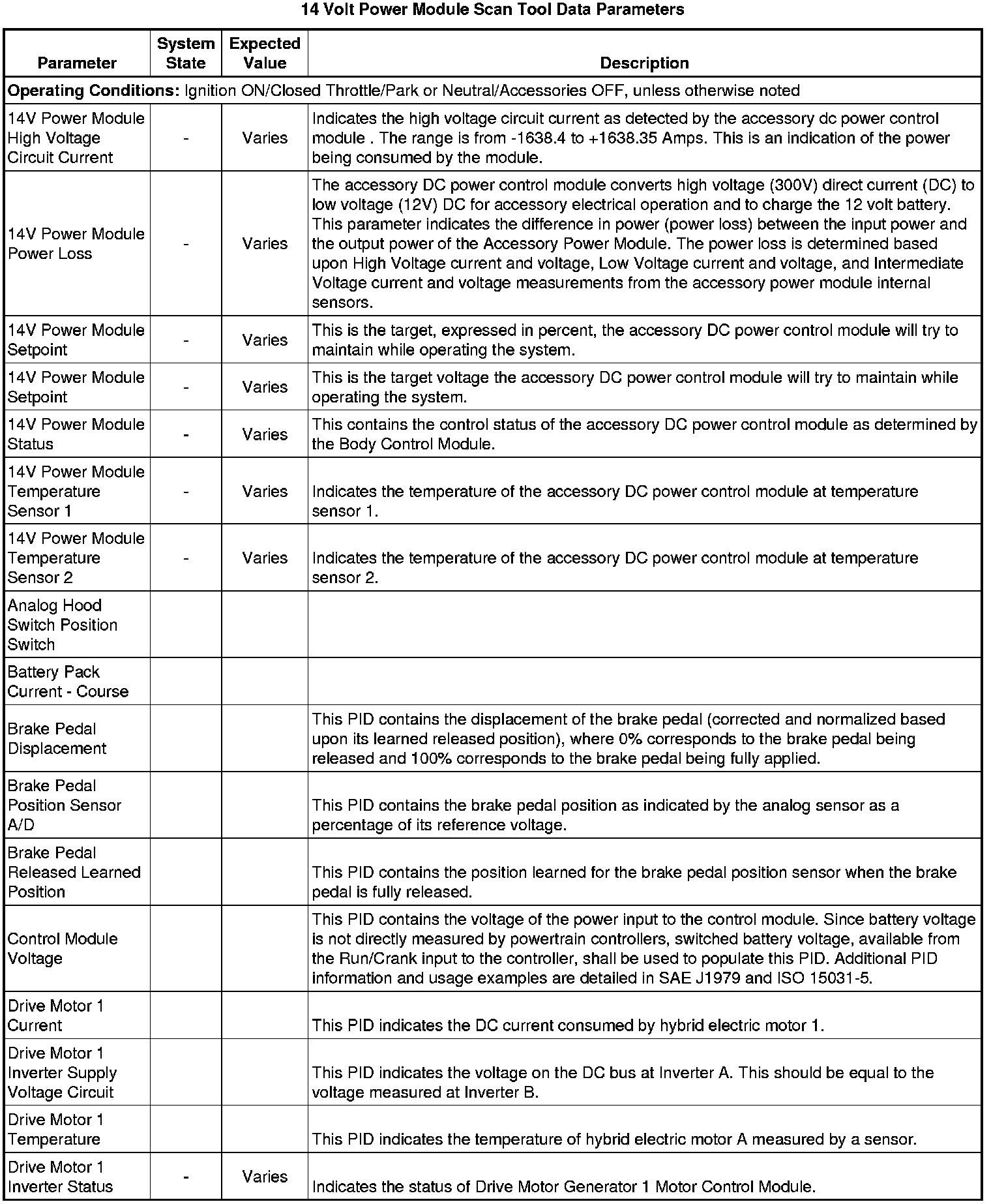 The 14 volt power module is a non-serviceable module within the generator control module. The 14 Volt Power Module Scan Tool Data Parameters list contains hybrid controls-related parameters. The list is arranged in alphabetical order.