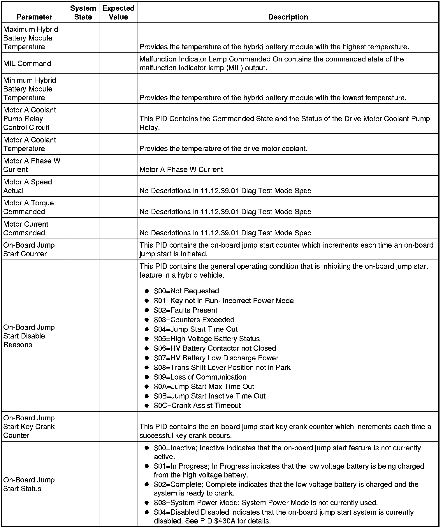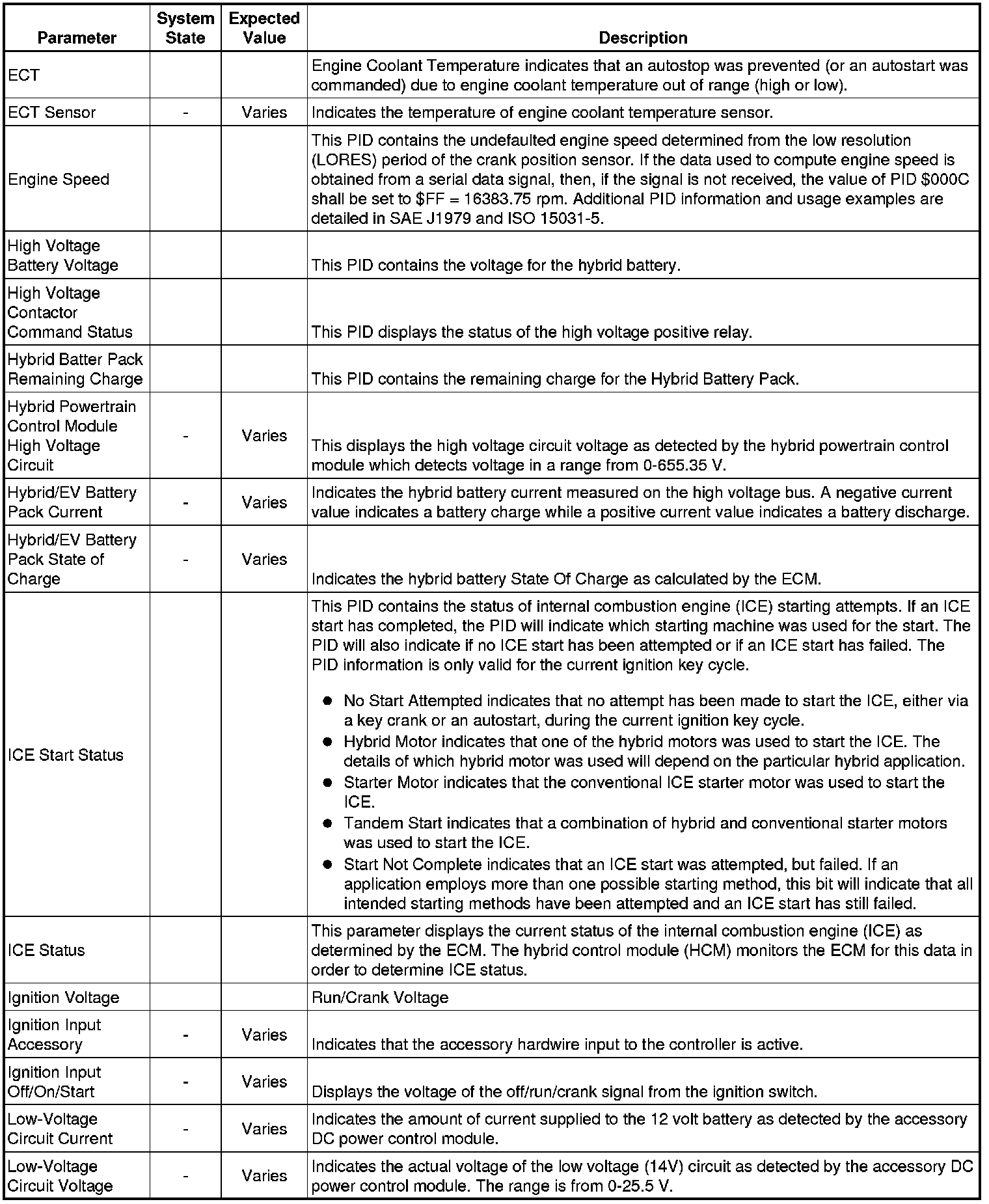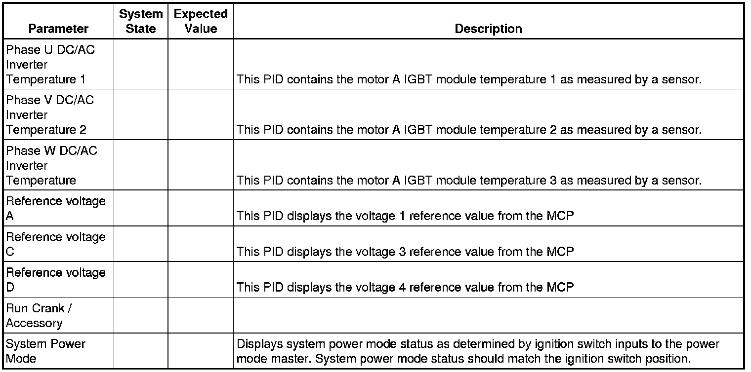 Only the parameters listed below are referenced in this service manual for use in diagnosis. If all values are within the typical range described below, refer to Symptoms - Hybrid Controls Symptoms - Hybrid Controls for diagnosis.