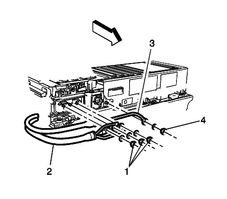 5. Remove the high voltage 3-phase cable terminal nuts (1) and the 12V terminal branch nut (4).