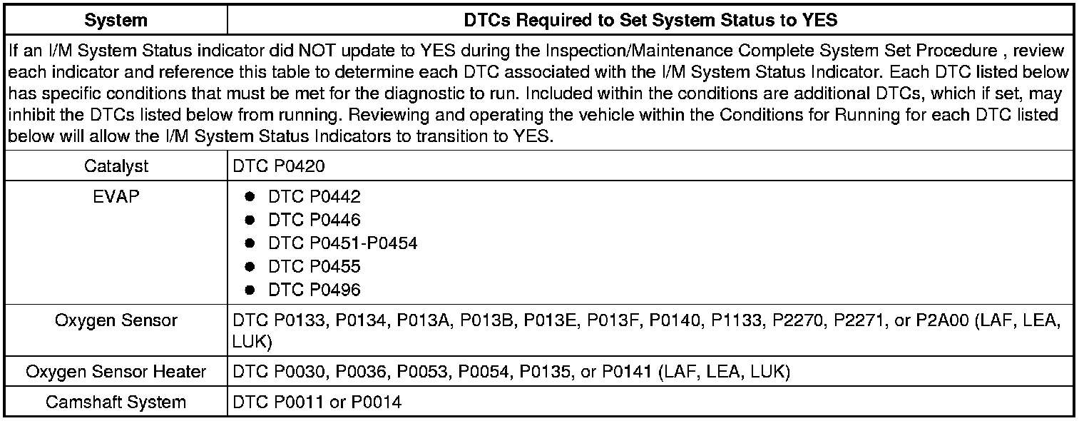 Inspection/Maintenance (I/M) Test DTC Table