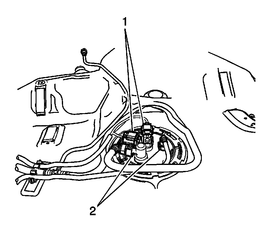 2. Disconnect the fuel pump electrical connector (1) and the quick connects (2). Refer to Plastic Collar Quick Connect Fitting Service Procedures.