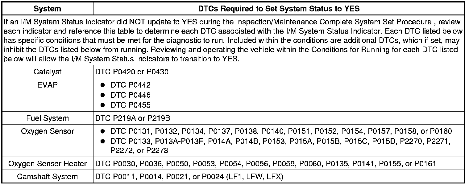 Inspection/Maintenance (I/M) Test DTC Table