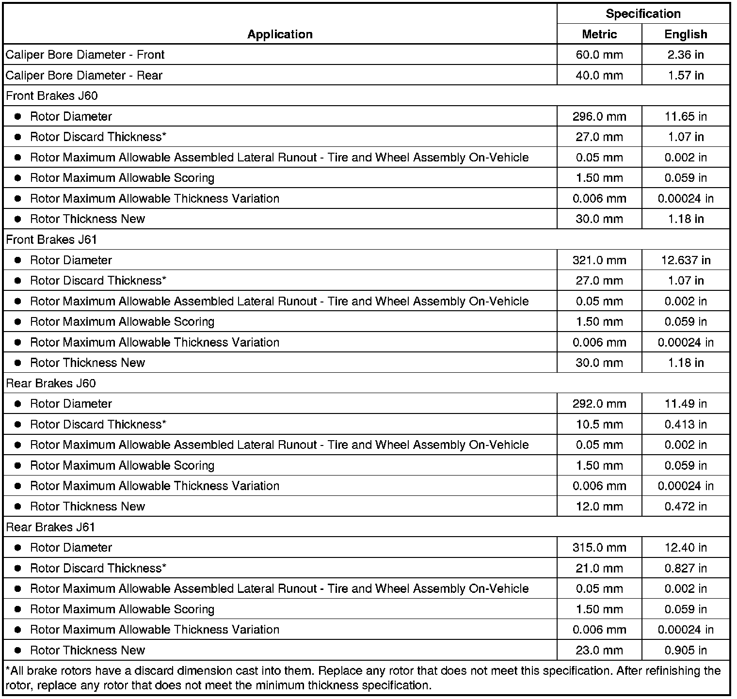 Disc Brake Component Specifications