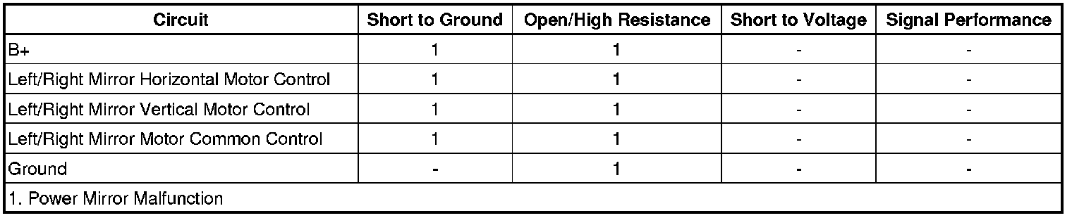 1. Ignition ON, with the mirror selector switch in the DRIVER position, command the mirrors UP, DOWN, LEFT, and RIGHT using the mirror directional switch. The driver mirror should move in the commanded direction.