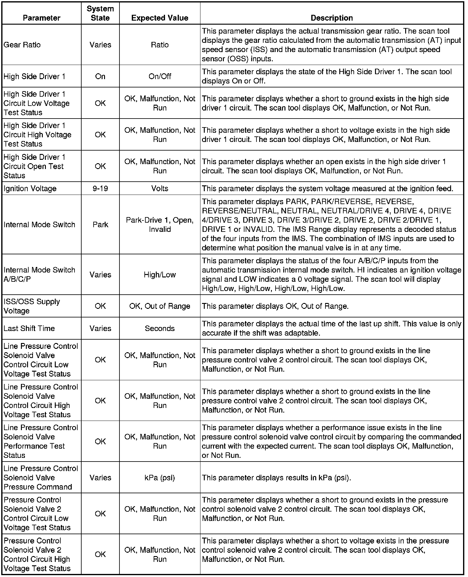 The Transmission Control Module Scan Tool Data List contains all transmission related parameters that are available on the scan tool. The list is arranged in alphabetical order. A given parameter may appear in any one of the data lists, and in some cases may appear more than once, or in more than one data list in order to group certain related parameters together.