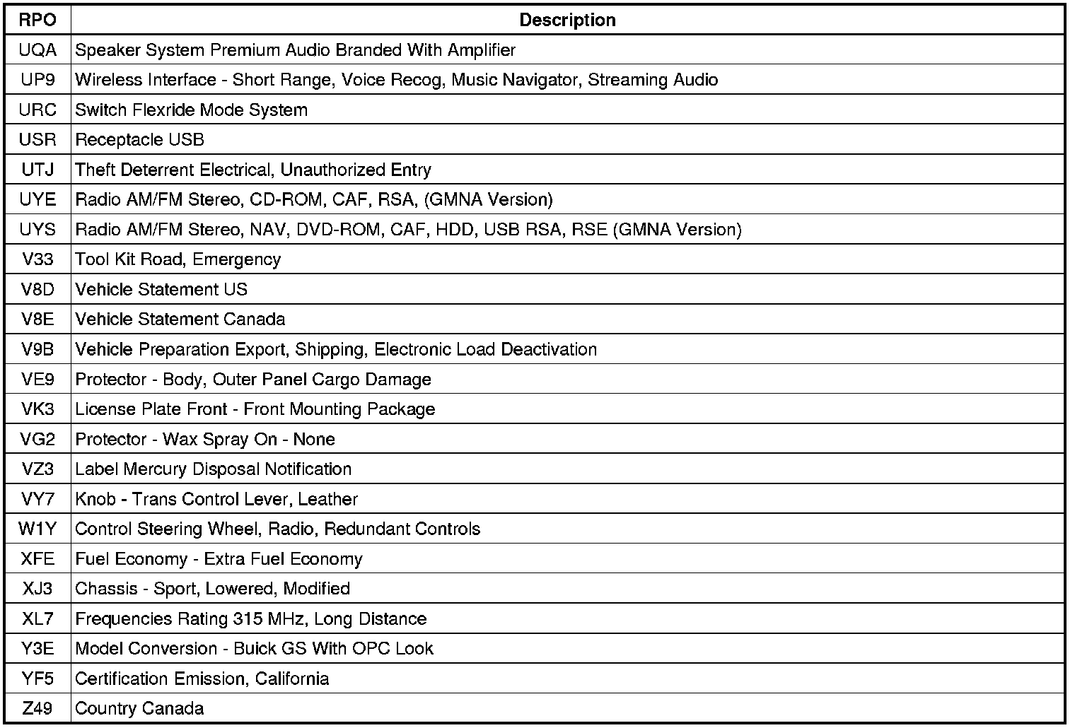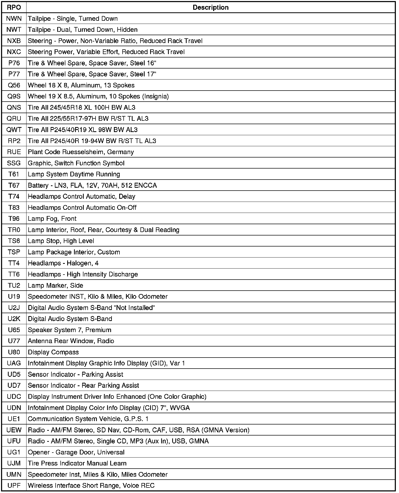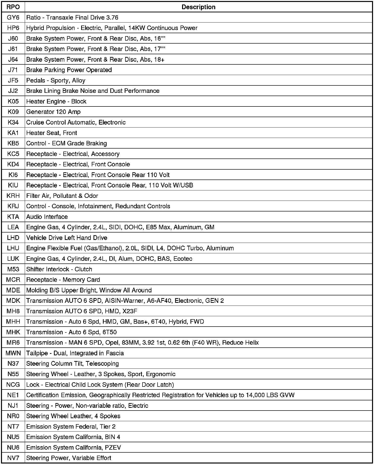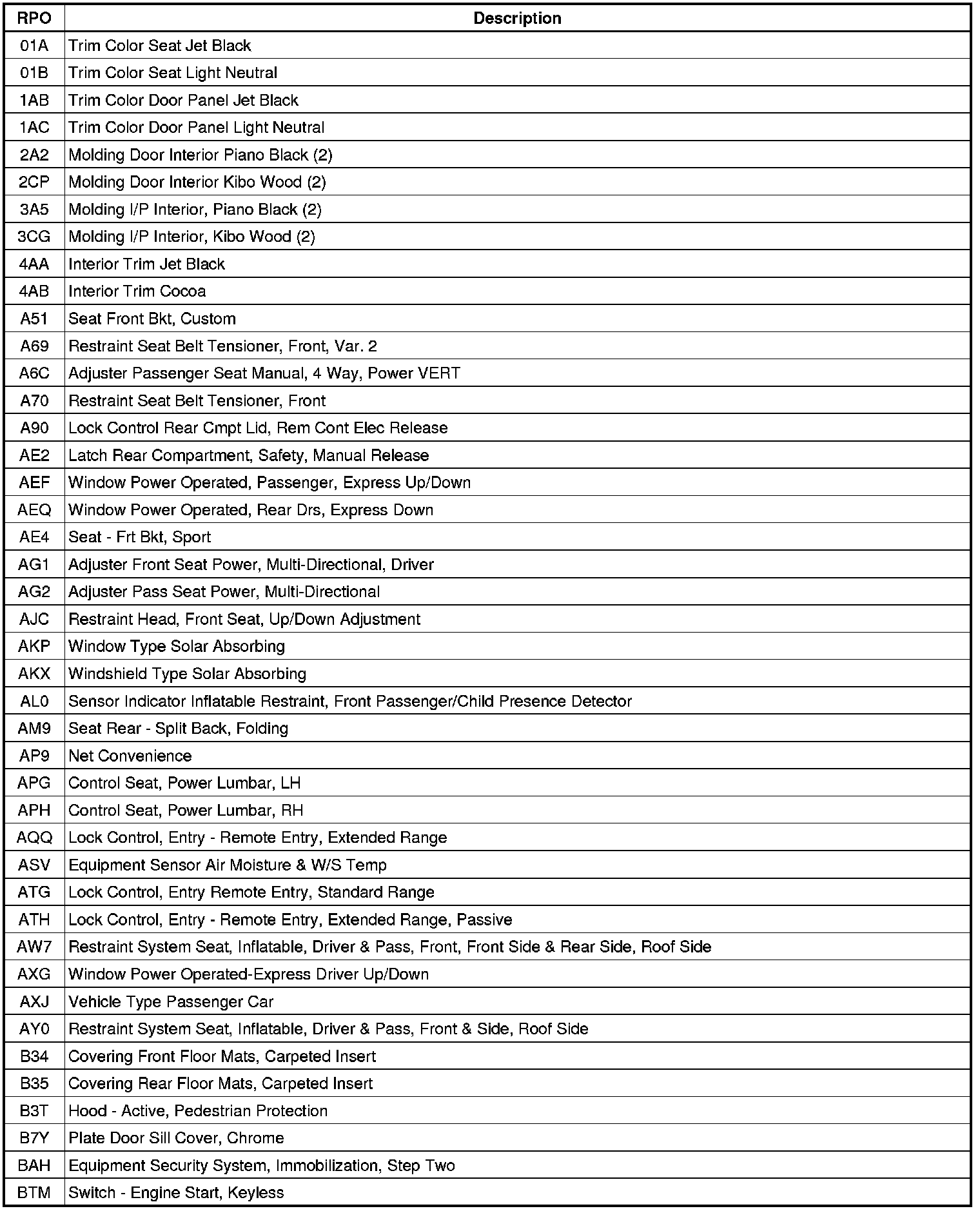 The following table provides the description of the Regular Production Option (RPO) codes that are available on the vehicle. The vehicle's RPO list is printed on the Service Parts Identification Label.