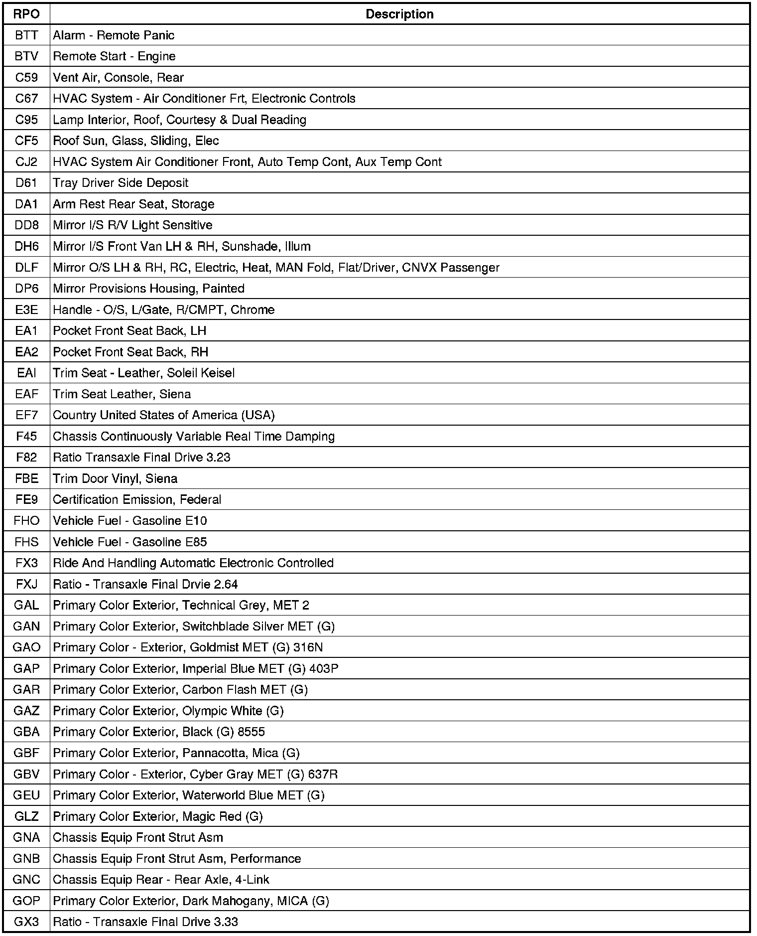 RPO Code List