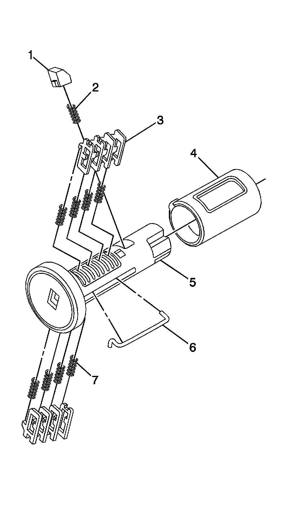 The ignition lock cylinder uses 8 key cut positions, 1-8. The ignition cylinder tumblers (3) are located on alternate sides of the cylinder (5). They are not snap-in and are not self-retaining. It follows the key code with the first tumbler being the first depth of the key code, closest to the head of the key.