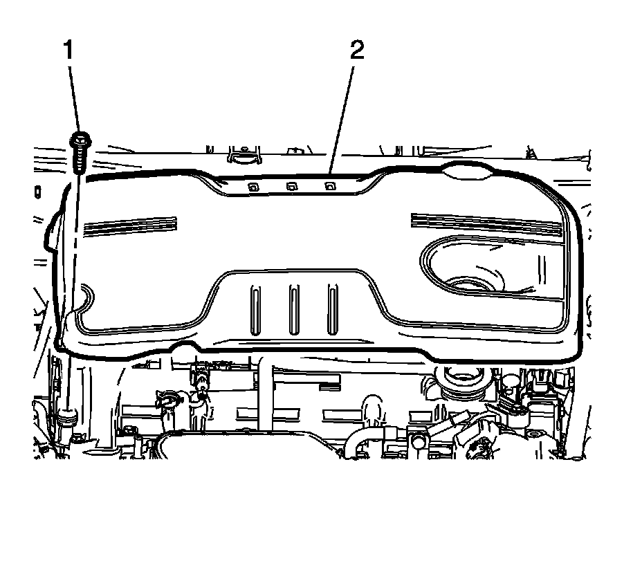 2. Remove the intake manifold cover (2). Refer to Intake Manifold Cover Replacement Intake Manifold Cover Replacement