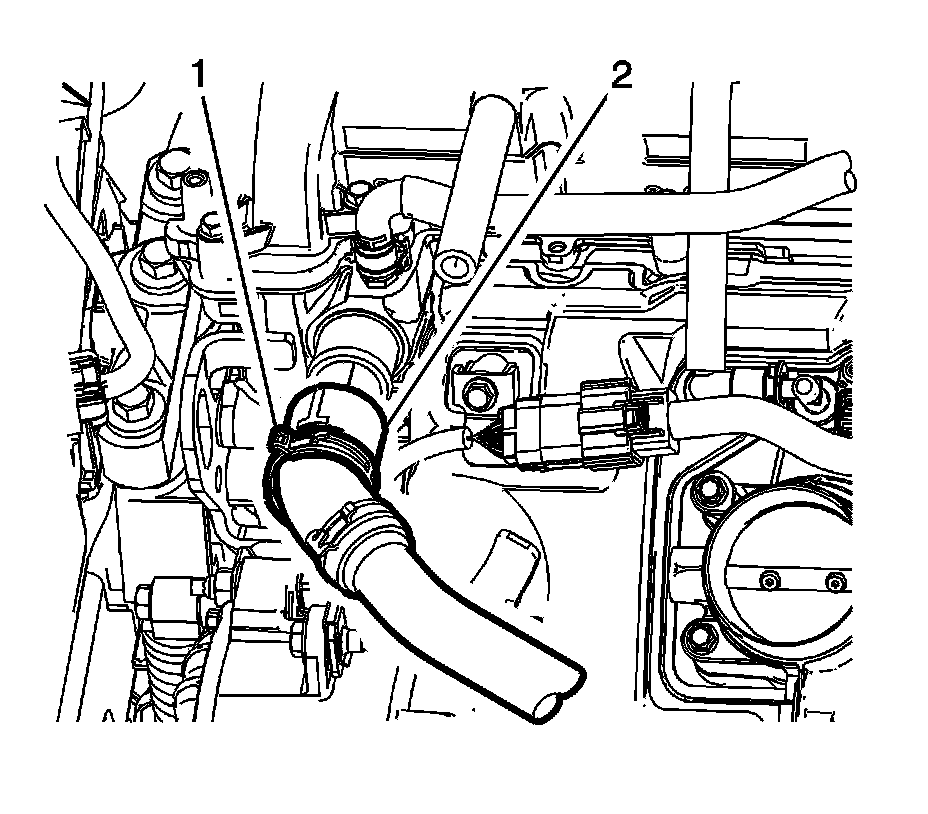 3. Reposition the hose clamp (1) and disconnect the radiator inlet hose (2). Refer to Radiator Inlet Hose Replacement (LUK) Radiator Inlet Hose Replacement (LUK)Radiator Inlet Hose Replacement (LHU) Radiator Inlet Hose Replacement (LHU)Radiator Inlet Hose Replacement (LEA) Radiator Inlet Hose Replacement (LEA).