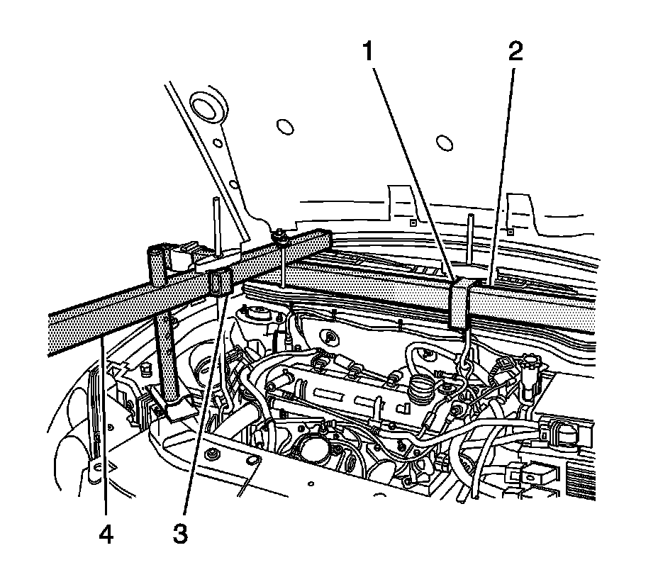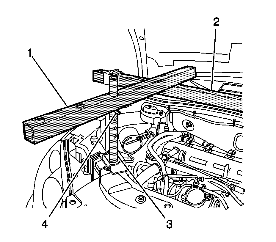 13. Install the other lift hook and bracket assembly (3) to the J-28467-2A radiator shelf tube (4) above the engine front lift bracket.