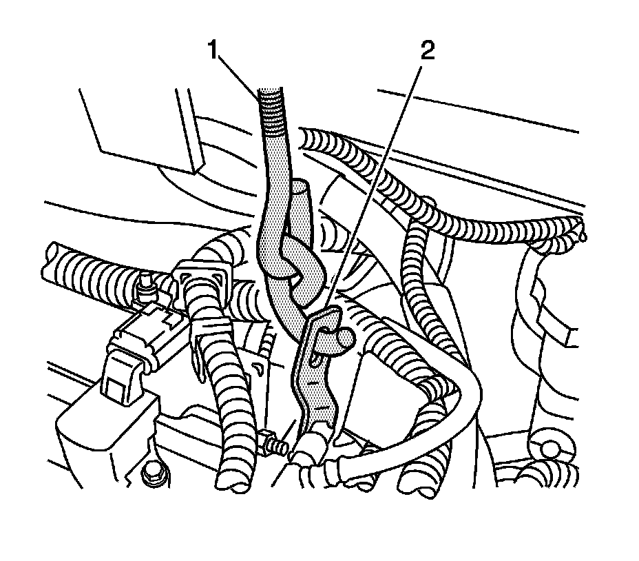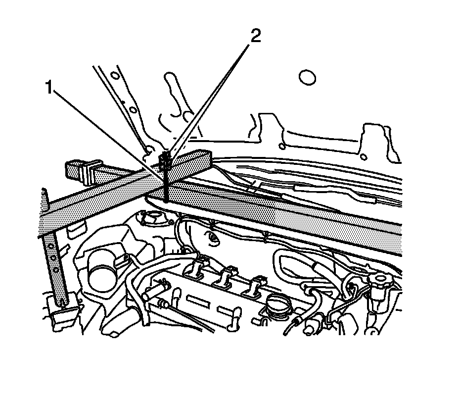 3. From the EN-28467-500B - universal engine support fixture, install the radiator shelf tube J-28467-2A (1) on top of the strut tower tube J-28467-3 (2) above the engine front (right back) lift hook bracket.