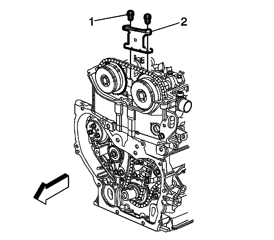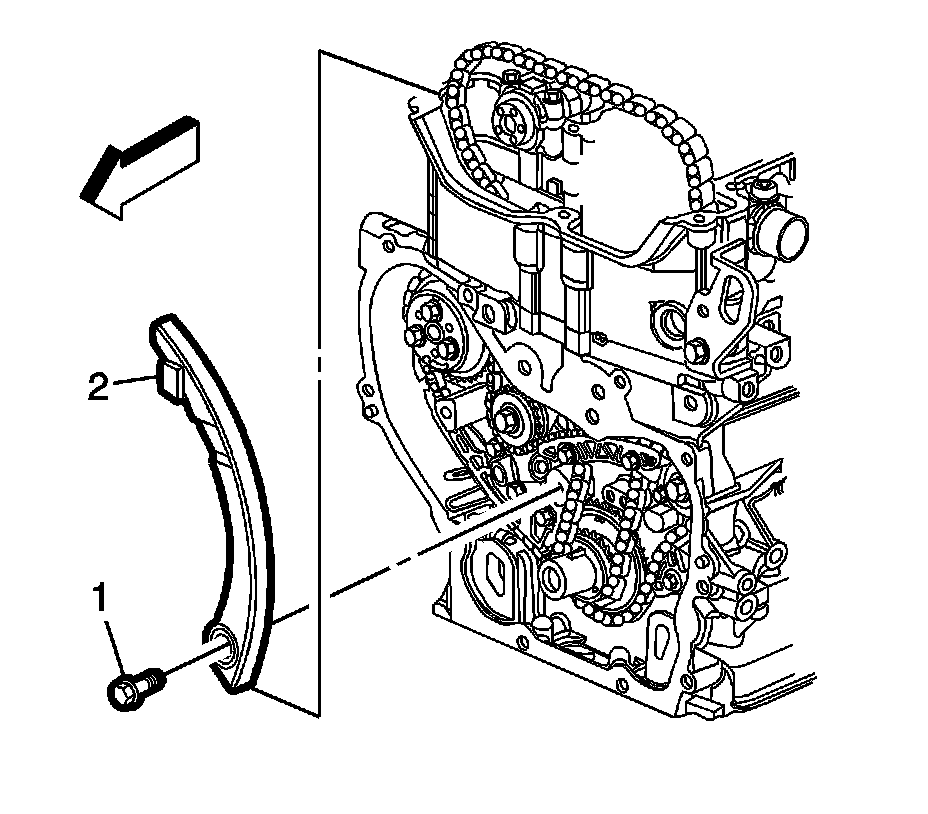 18. Install the fixed timing chain guide (2) and bolts (1). Tighten the fixed timing chain guide bolts to 12 Nm (106 lb in).