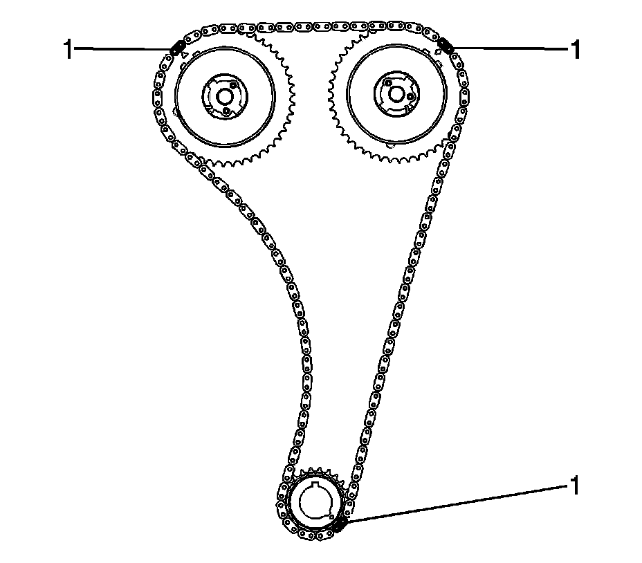 * There are 3 colored links on the timing chain. Two links are of matching color, and 1 link is of a unique color. Use the following procedure to line up the links with the actuators. Orient the chain so that the colored links are visible.
