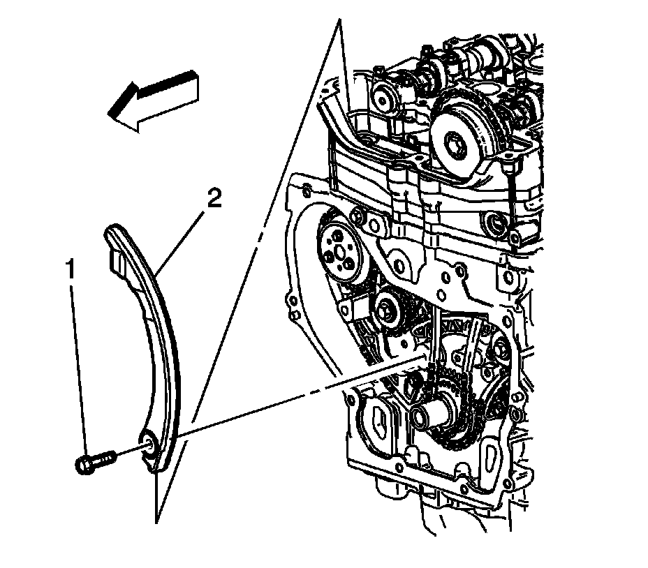 10. Remove the timing chain tensioner guide bolt (1) and guide (2).