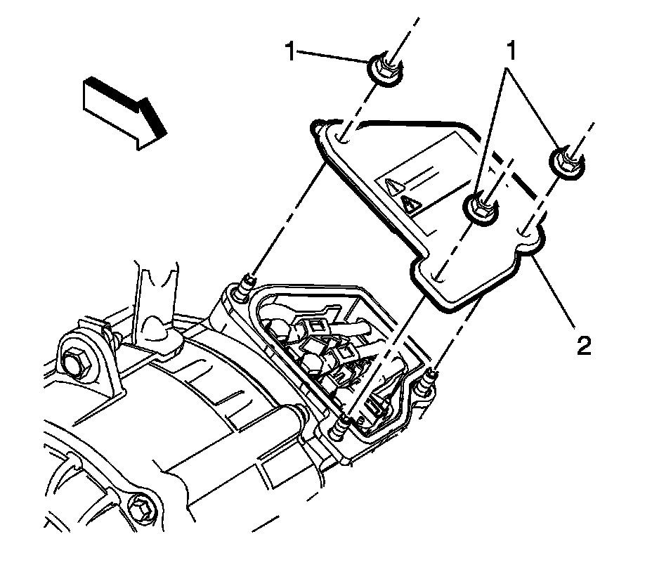 11. Install the drive motor generator battery cable cover nuts (1) and the drive motor generator battery cable cover (2). Tighten to 9 Nm (80 lb in).