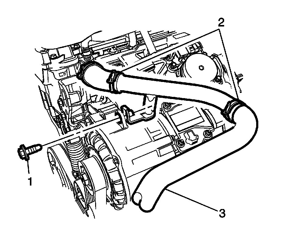 13. Install the radiator inlet hose (3), the radiator inlet hose clamps (2) and tighten the bracket bolt (1) to 9 Nm (80 lb in).
