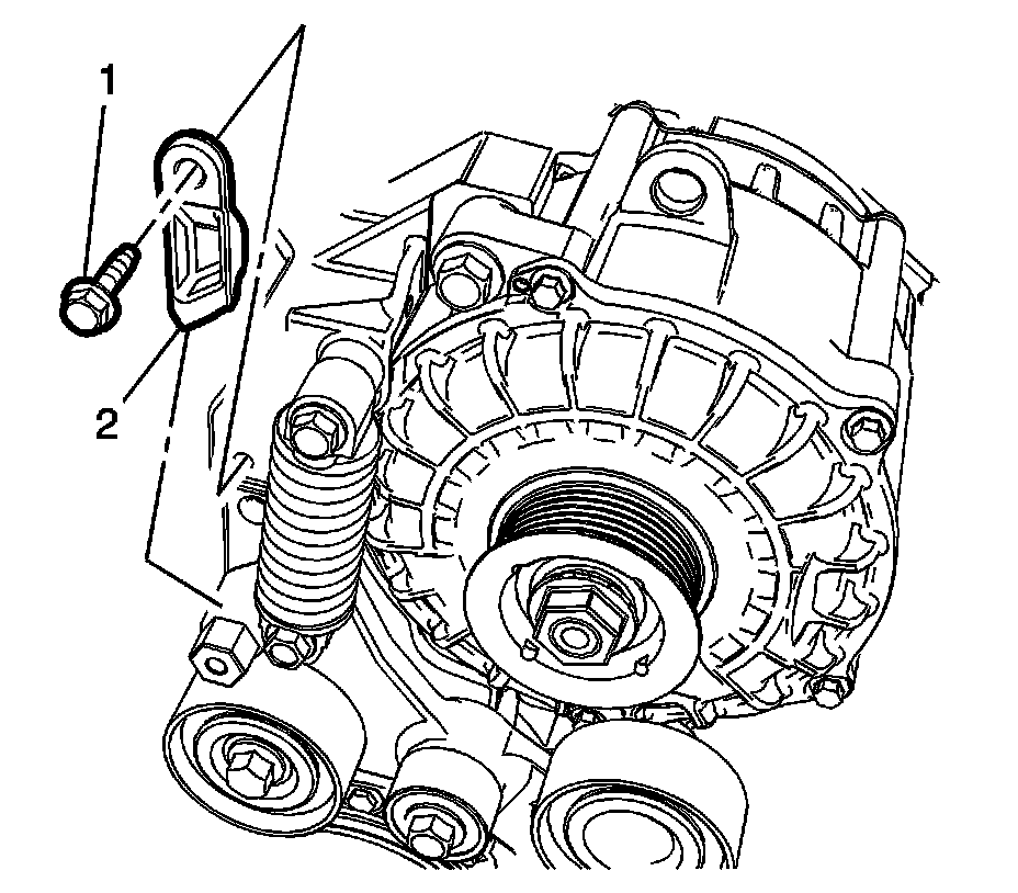 2. For ease of service, replace the stud (1) with a new starter generator lower bolt (2) from the parts catalog and apply medium LOCTITE to the bolt. Tighten to 58 Nm (41 lb ft).