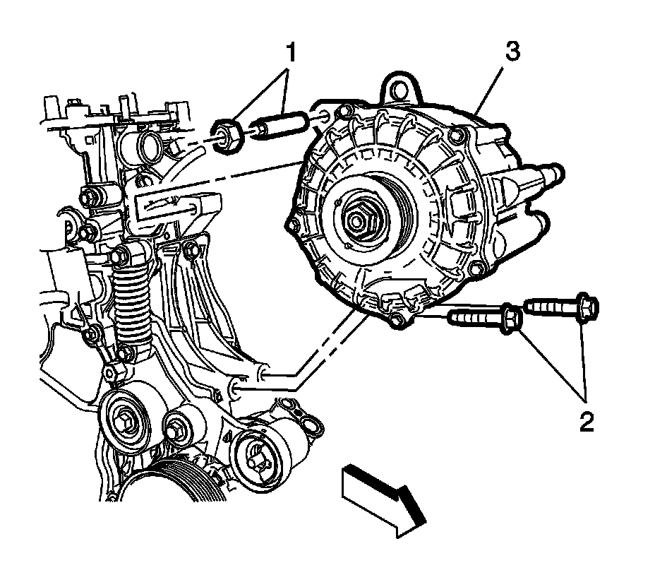 3. Install the starter generator lower bolts (2) and tighten to 58 Nm (41 lb ft).