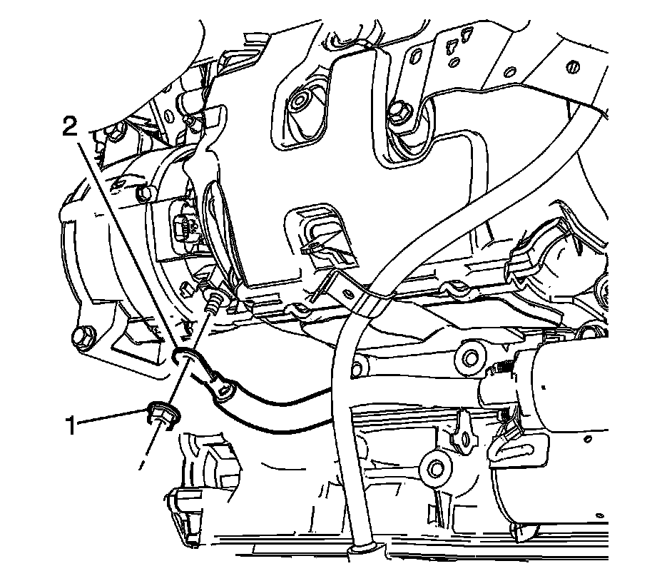 2. Remove the battery negative extension cable fastener (1) and terminal (2) from the left front frame rail.