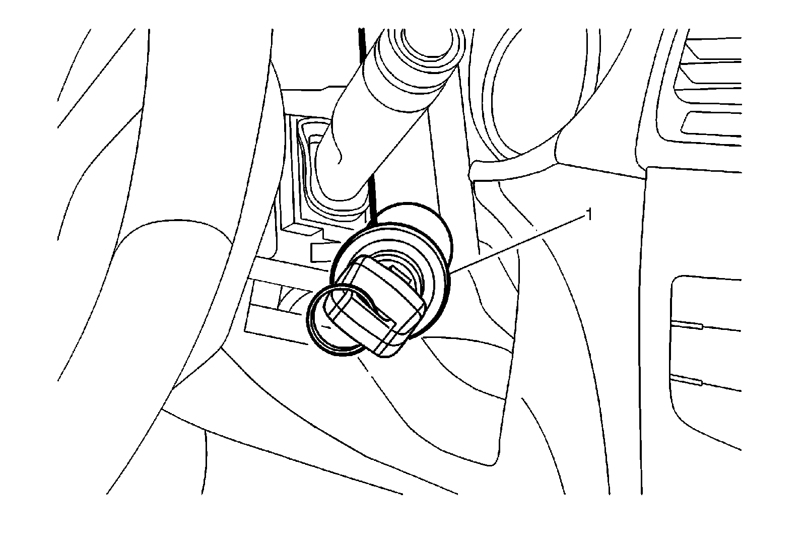 4. Push a pick-type tool into the access hole (1) in the ignition and start switch housing and press the ignition lock cylinder lock tab down.
