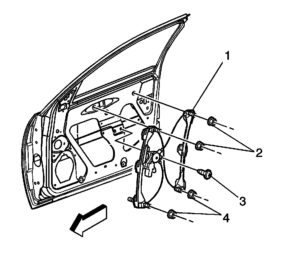 * Loosen the fasteners that attach the window regulator (1) to the inner door panel, in the specified sequence (2, 3, 4).