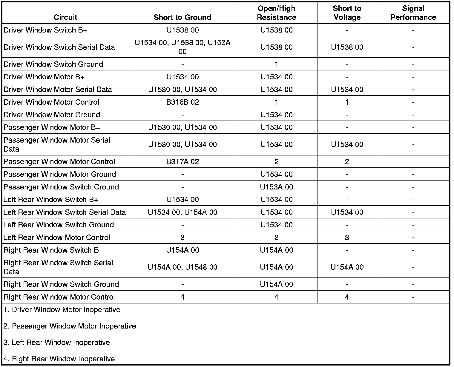 • If the driver and passenger windows do not perform as specified, refer to Both Front Windows Inoperative.