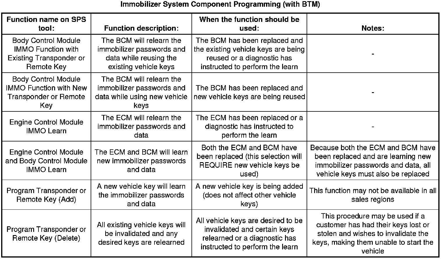 Depending on the immobilizer function being learned or the component replaced, different learn functions are required to be performed. These learn functions are as follows: