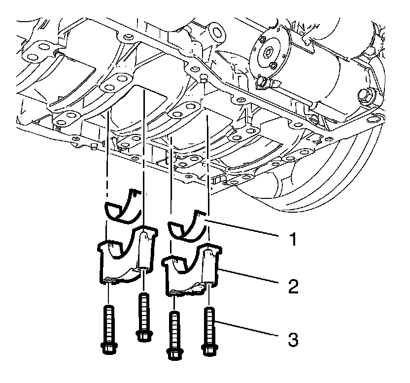 7. Install the 4 bearing caps bolts (3) and tighten a first pass to 25 Nm (18 lb ft).