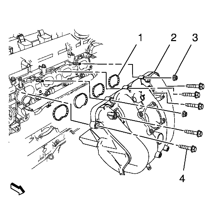 4. Remove the 2 intake manifold nuts (3) and the 5 intake manifold bolts (4).