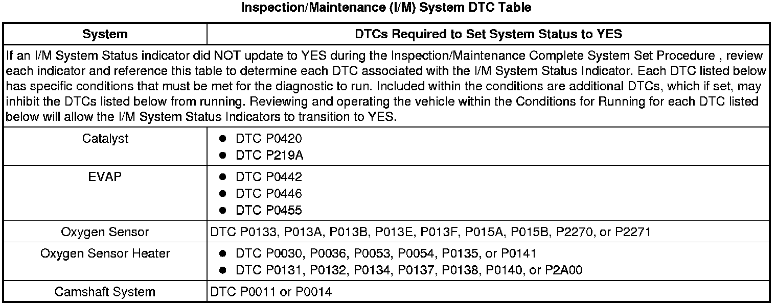 Inspection/Maintenance (I/M) System DTC Table