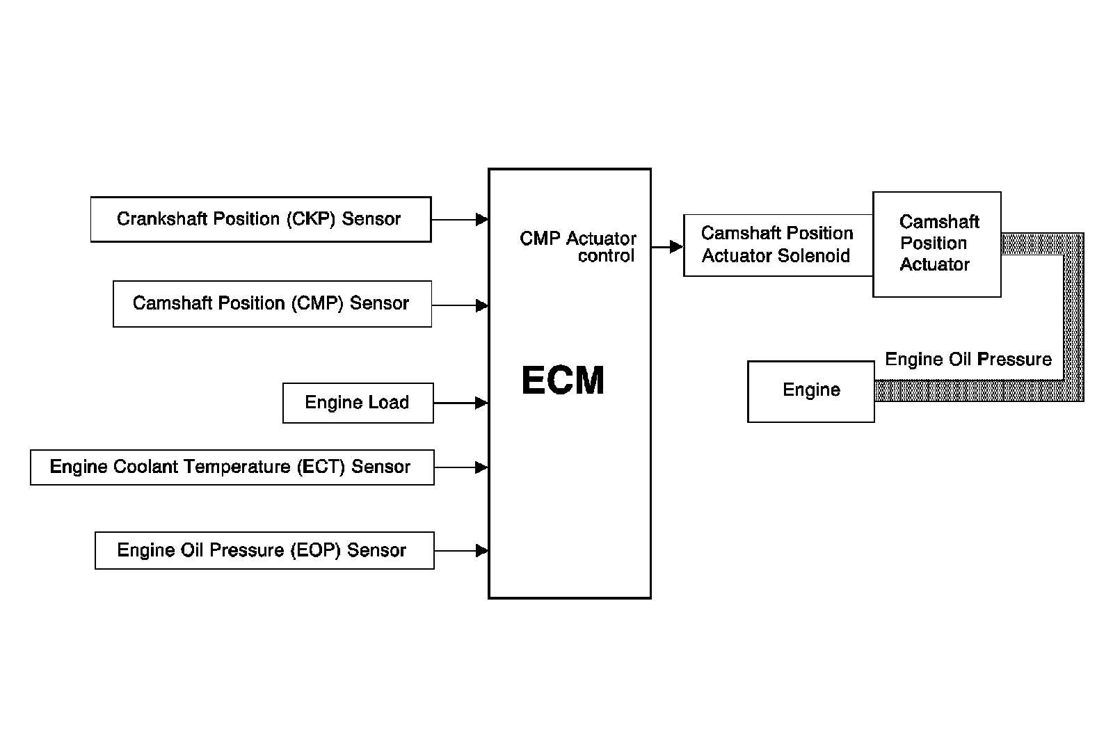 The CMP actuator system is controlled by the engine control module (ECM). The ECM sends a signal to a CMP actuator solenoid in order to control the amount of engine oil flow to a Cam Actuator passage. The pressurized engine oil is sent to unseat the locking pin, and to the vane and rotor assembly of the CMP actuator. There are 2 different passages for oil to flow through, a passage for cam advance and a passage for cam retard. The Cam Actuator is attached to a camshaft and is hydraulically operated in order to change the angle of the camshaft relative to crankshaft position (CKP). Engine oil pressure (EOP), viscosity, temperature and engine oil level can have an adverse affect on Cam Actuator performance.
