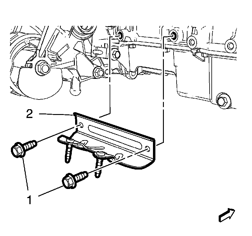 2. Install the 2 catalytic converter brace bracket bolts (1) and tighten to 58 Nm (43 lb ft).