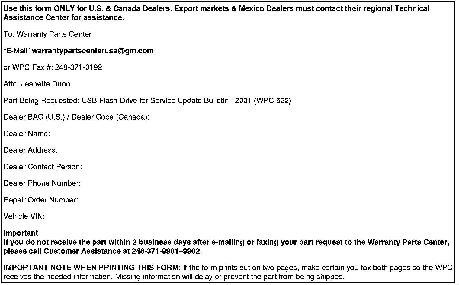 IMPORTANT NOTE WHEN PRINTING THIS FORM: If the form prints out on two pages, make certain you fax both pages so the WPC receives the needed information. Missing information will delay or prevent the part from being shipped.