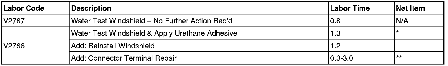 Dealers are to perform a water test to detect a water leak. If a leak is found, dealers are to reseal the area and perform another water test. If leaking is still present, the windshield is to be reinstalled. If evidence of a leak is found, the connectors are to be inspected to determine if any terminals are corroded. Corroded terminals are to be replaced.