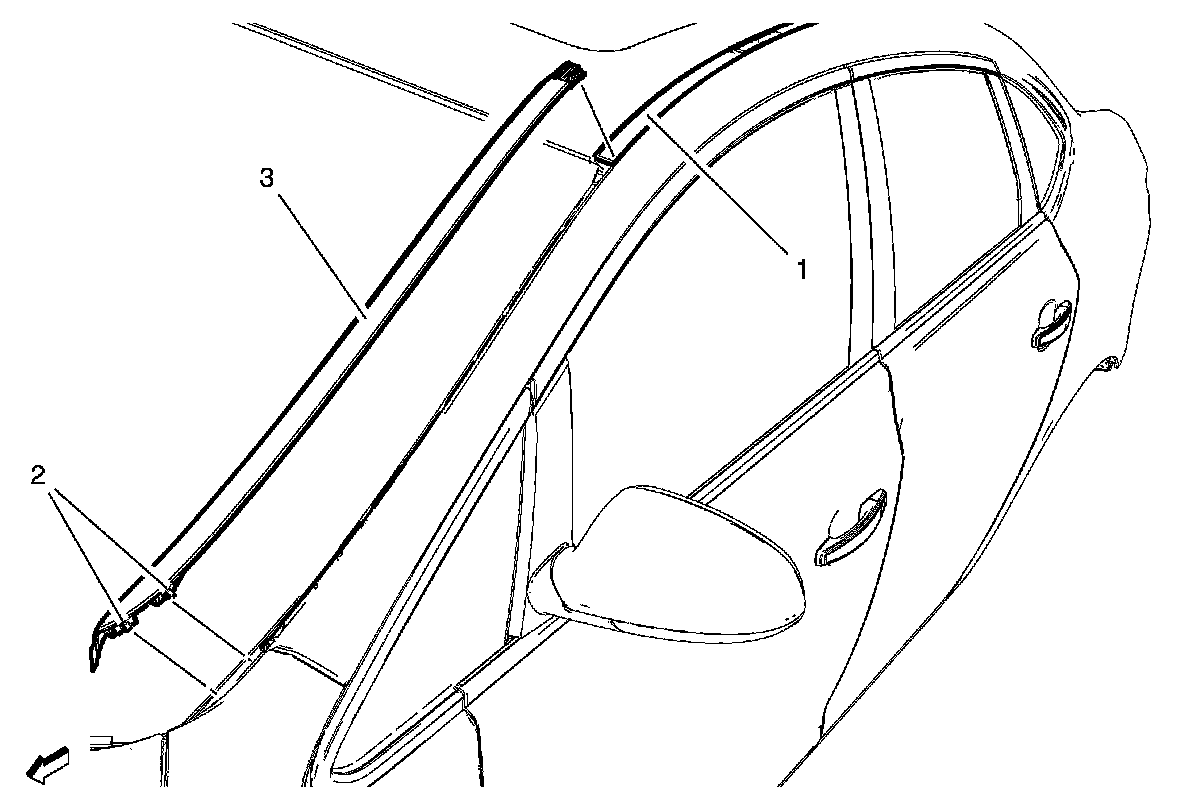 Service Procedure1. Using a body trim tool or equivalent, remove the windshield side reveal molding. Refer to Windshield Side Reveal Molding Replacement in SI.