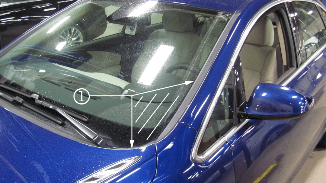 3. Perform a windshield water leak test on the driver side of the windshield in the A-pillar area of the windshield using a water hose without the nozzle attached. Refer to photograph to view where to apply water (1).