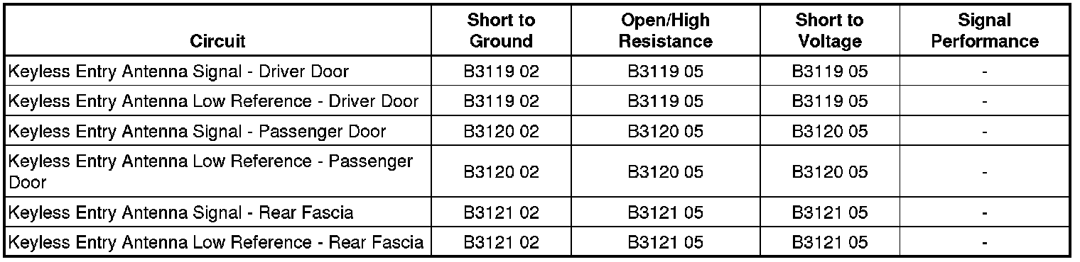 The keyless entry antennas are used as short range low frequency transmitters. As a vehicle with locked doors is approached with a keyless entry transmitter and the exterior door handle button/rear closure touch pad is pressed, the keyless entry antenna broadcasts a challenge to the transmitter in an approximate 1 meter range. If the response from the transmitter via radio frequency (RF) is valid, the locked door will be passively unlocked/unlatched and allow the door to be opened. A low transmitter battery or radio frequency (RF) interference from aftermarket devices such as 2-way radios, power inverters, cellular phone chargers, computers, etc. may cause a system malfunction. High RF traffic areas, such as gas stations which use pay-at-the-pump RF transponders, may also cause interference that could lead to a malfunction.