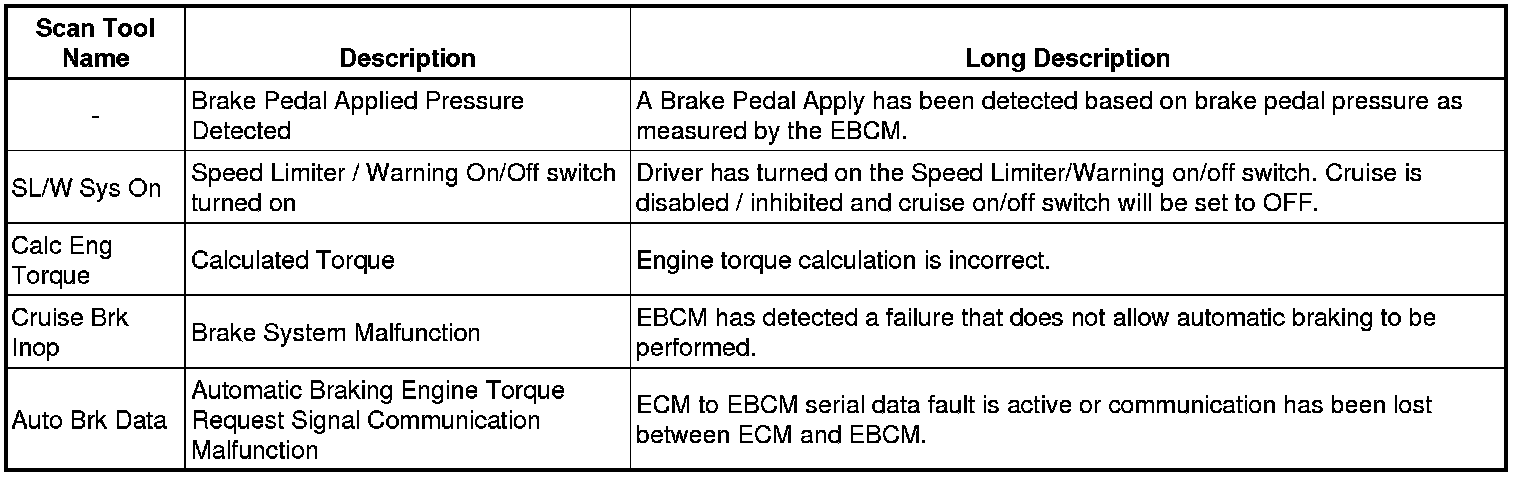 Every time the Cruise Control System is disengaged, the ECM will keep track of the reason for system disengagement. The last 8 disengagement reasons will be recorded within the ECM memory. The scan tool will display the last 8 Cruise Disengage History parameters, in which one out of approximately 50 possible reasons will be displayed in each of these 8 parameters. For the disengagement reason to be displayed within the scan tool parameter either the Cruise Control System is active and disengagement is requested, or engagement of the system is requested but a fault is present.