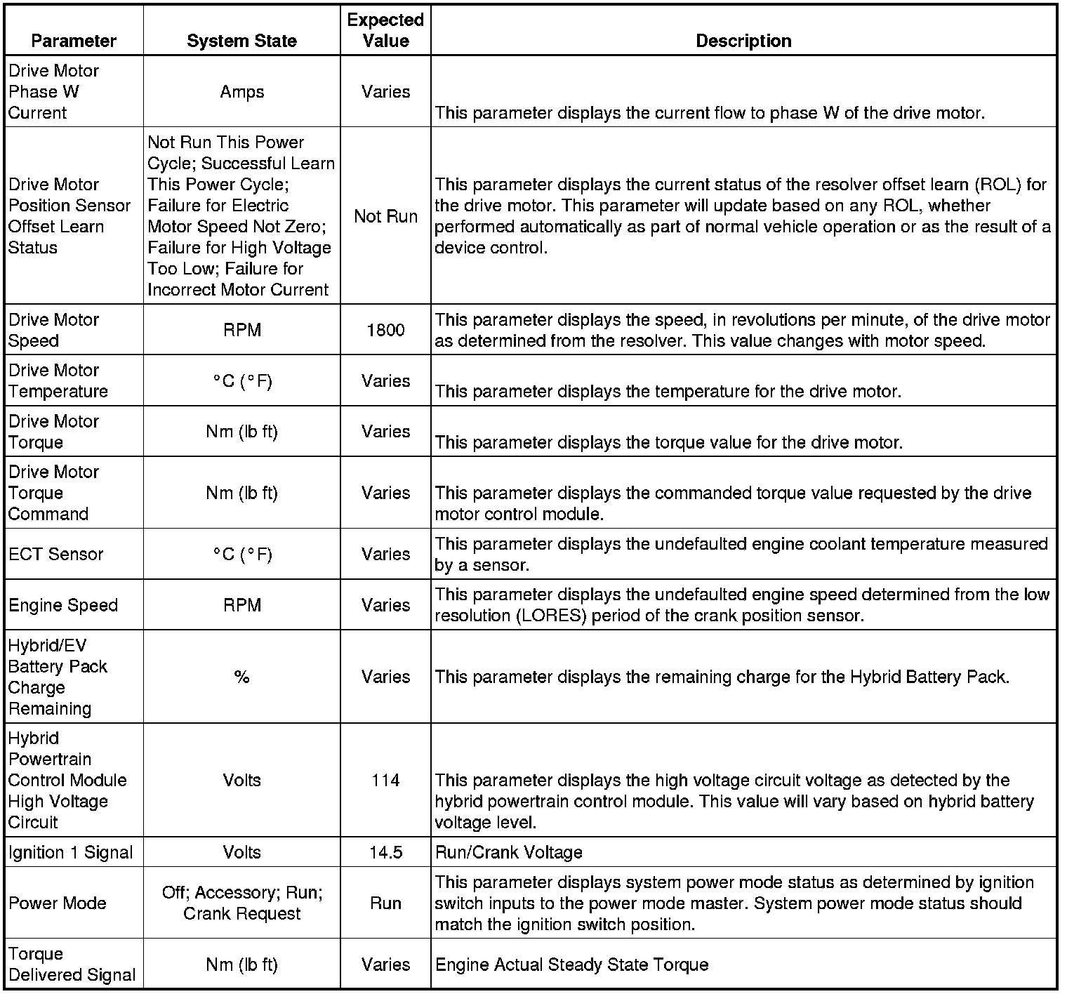Only the parameters listed below are referenced in this service manual for use in diagnosis. If all values are within the typical range described below, refer to Symptoms - Hybrid Controls Symptoms - Hybrid Controls for diagnosis.