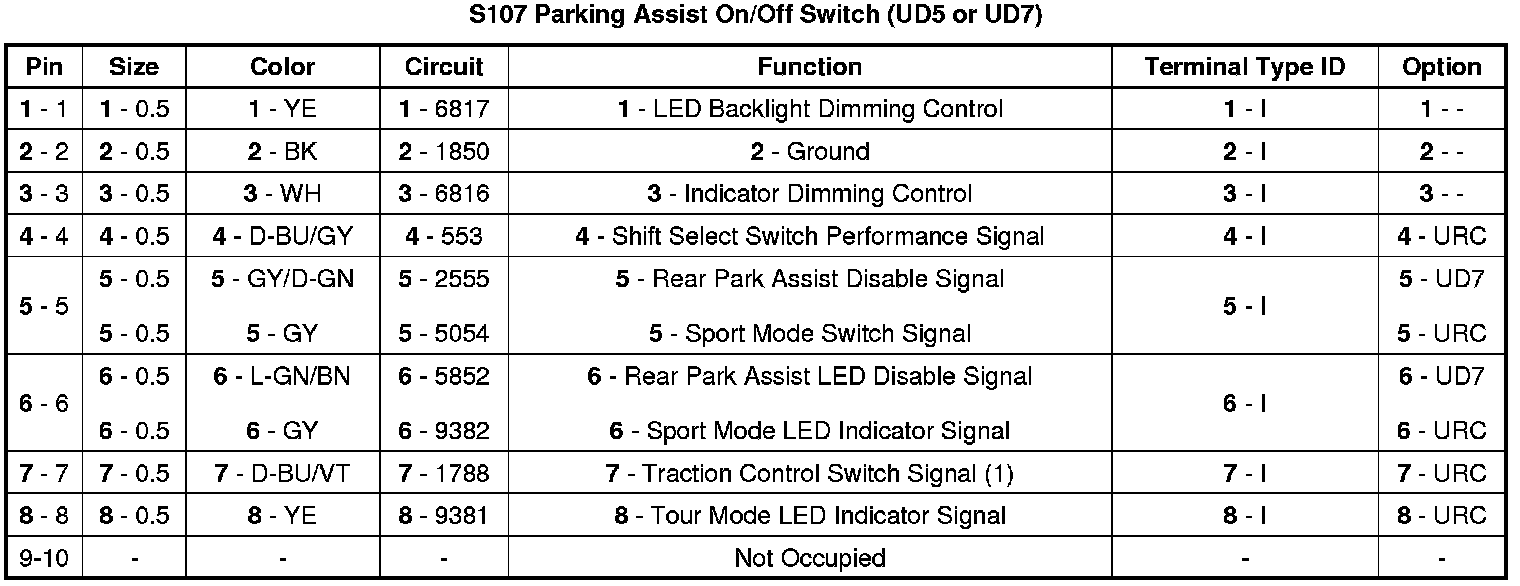 S107 Parking Assist On/Off Switch (UD5 or UD7)