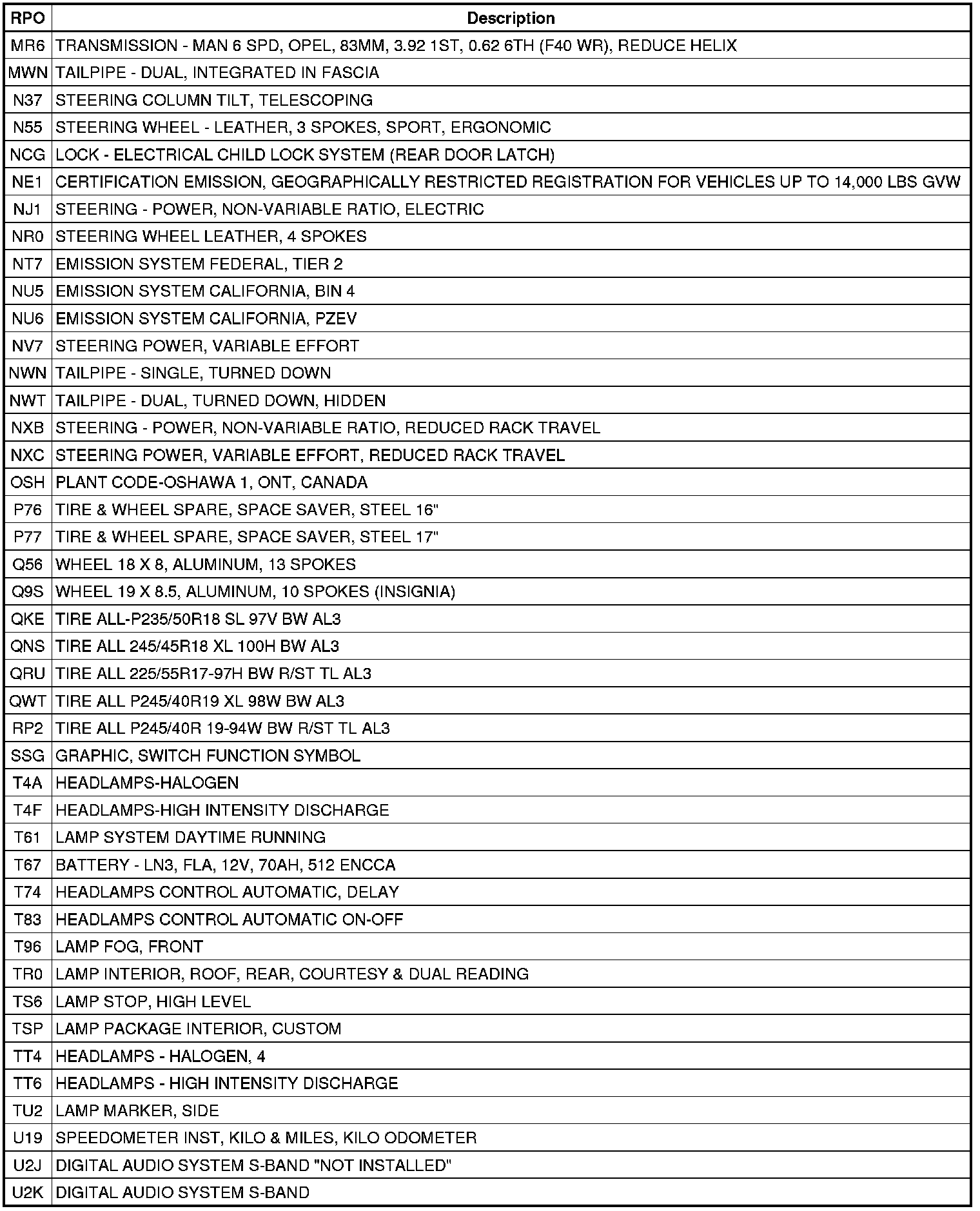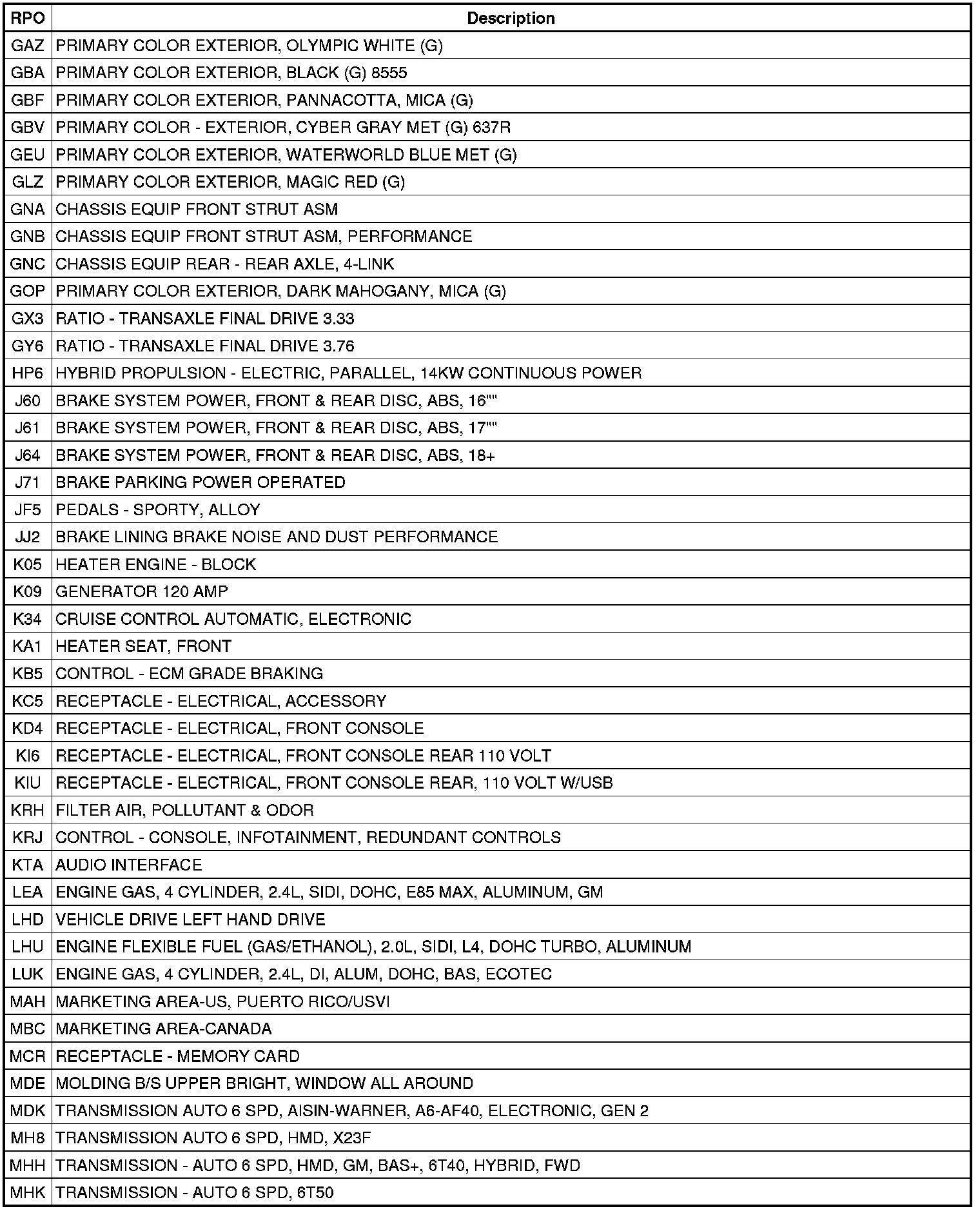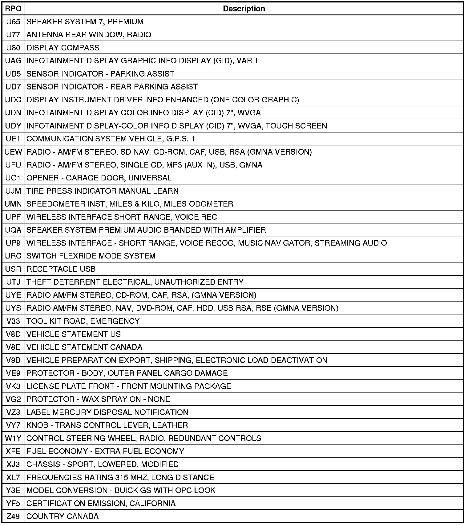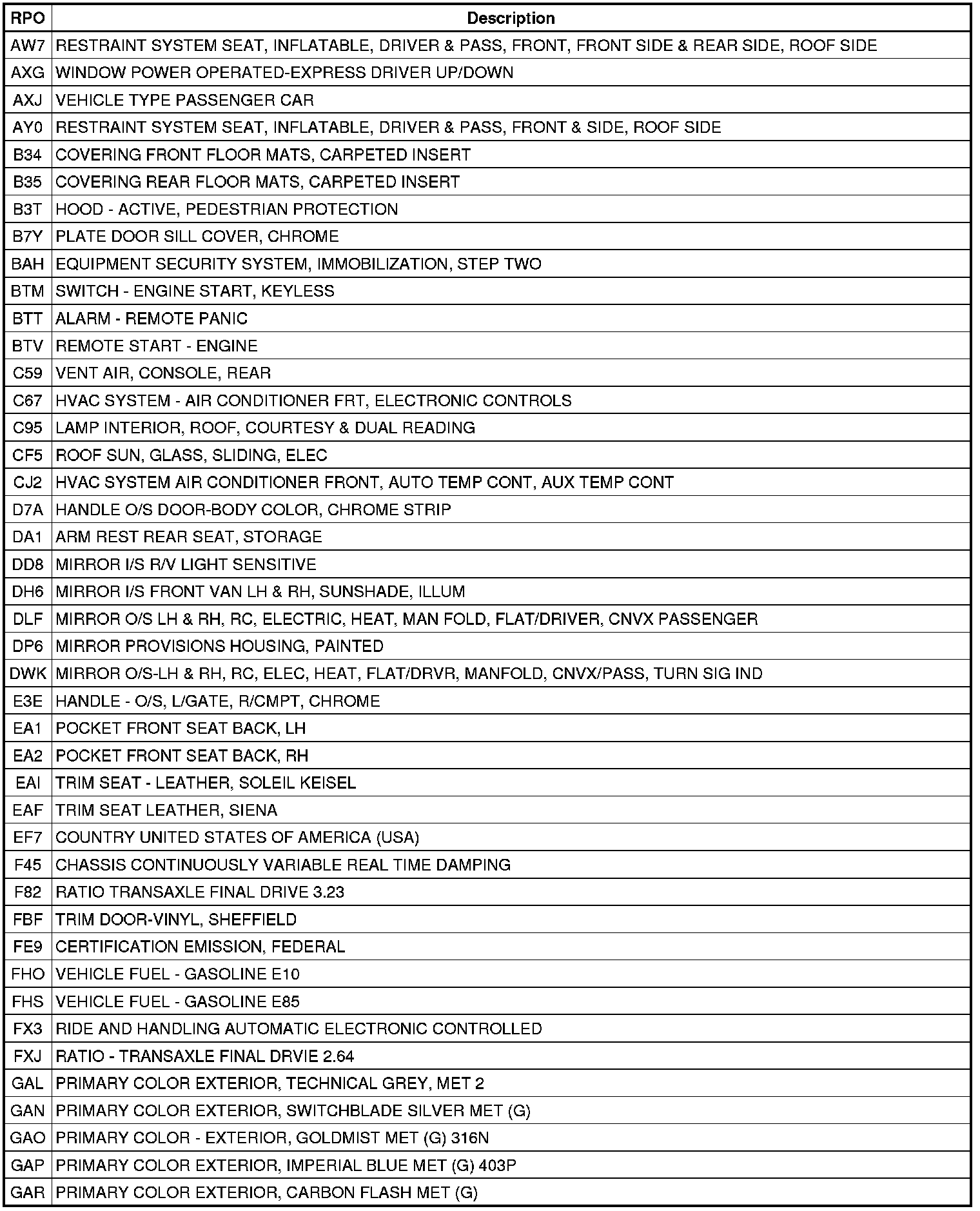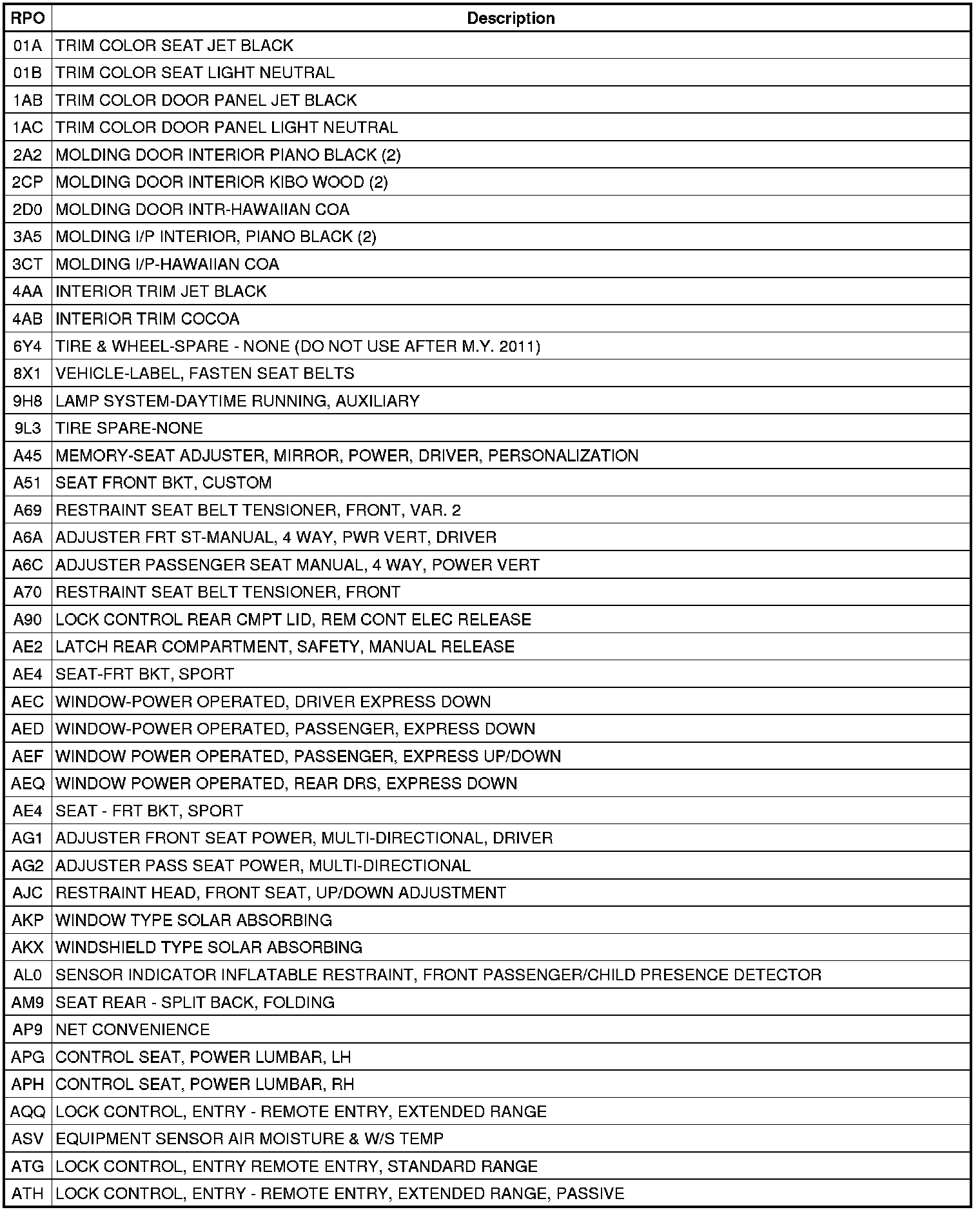 The following table provides the description of the Regular Production Option (RPO) codes that are available on the vehicle. The vehicle's RPO list is printed on the Service Parts Identification Label.