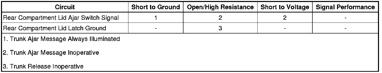 The Body Control Module (BCM) supplies a 12♦V signal to the rear compartment lid ajar switch signal circuit. When the Rear Compartment Lid Latch releases the rear compartment lid, the rear compartment lid ajar switch, which is internal to the Rear Compartment Lid Latch, is supplied with ground which causes the trunk ajar switch signal circuit to be pulled low. The BCM interprets this and communicates via serial data to the driver information center which will display the Trunk Open message.