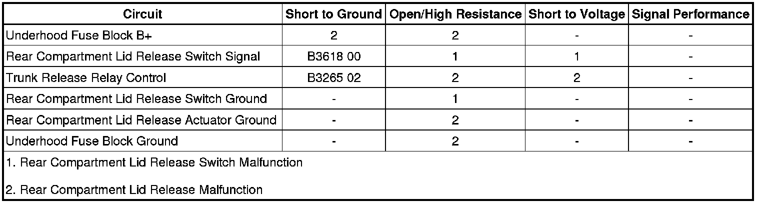 The Body Control Module supplies a 12 V reference voltage to the rear compartment lid unlatch switch through the release switch signal circuit. When the rear compartment lid unlatch switch is pressed, the release switch signal circuit is grounded through the rear compartment lid unlatch switch ground circuit and the reference voltage is pulled low within the Body Control Module. In response, the Body Control Module applies battery positive voltage to the compartment lid release relay control circuit, which energizes the coil side of the relay. The switch side of the compartment lid release relay then closes, supplying battery positive voltage through the relay and the rear compartment lid latch control circuit activating the latch so that the trunk lid may be manually raised to an open position.