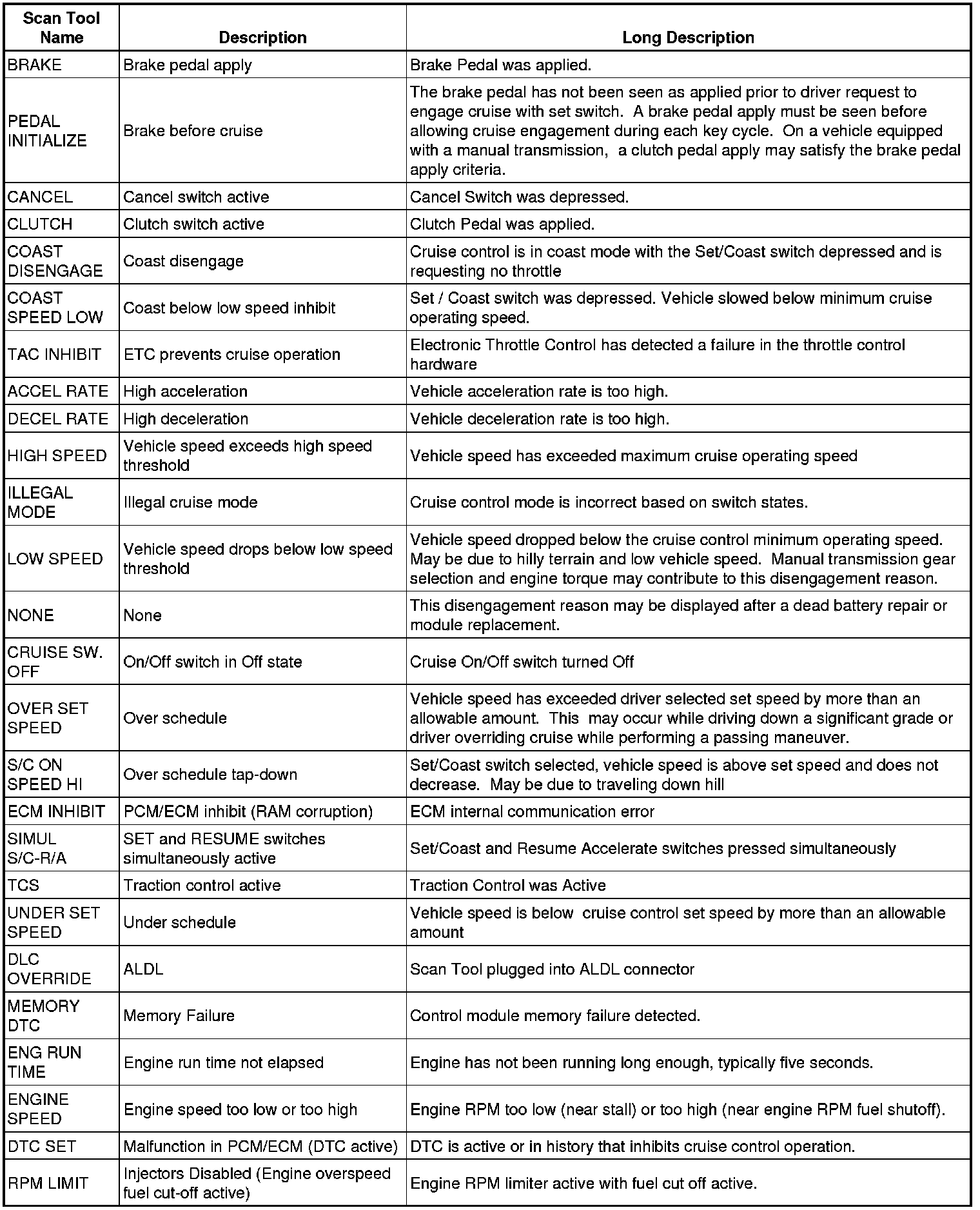 Every time the Cruise Control System is disengaged, the ECM will keep track of the reason for system disengagement. The last 8 disengagement reasons will be recorded within the ECM memory. The scan tool will display the last 8 Cruise Disengage History parameters, in which one out of approximately 50 possible reasons will be displayed in each of these 8 parameters. For the disengagement reason to be displayed within the scan tool parameter the Cruise Control System is active and disengagement is requested.