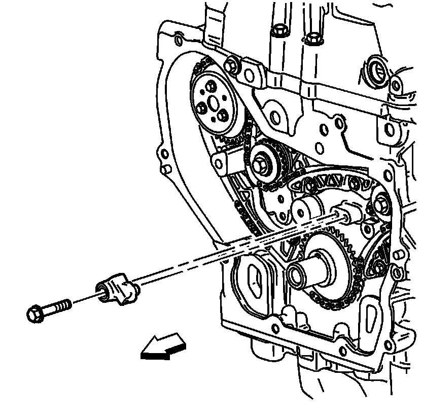 Note: The timing chain tensioner must be removed to unload chain tension before the timing chain is removed. If it is not, the timing chain will become cocked and it will be difficult to remove.