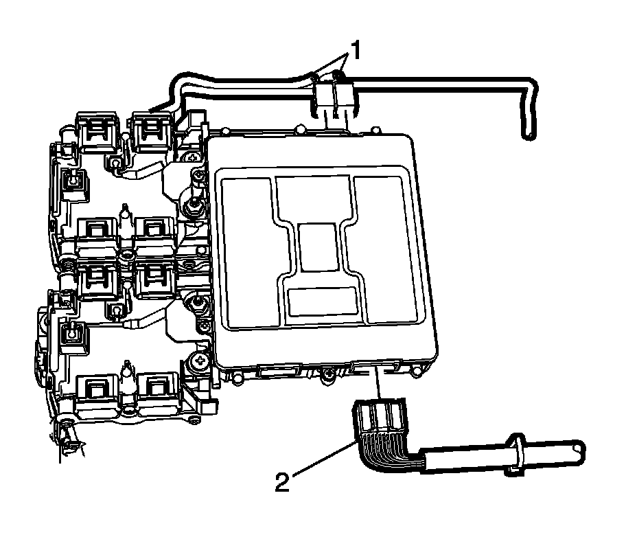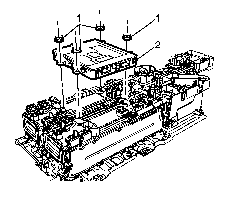 4. Remove the battery energy control module fasteners (1) and remove the battery energy control module (2) from the mounting studs.