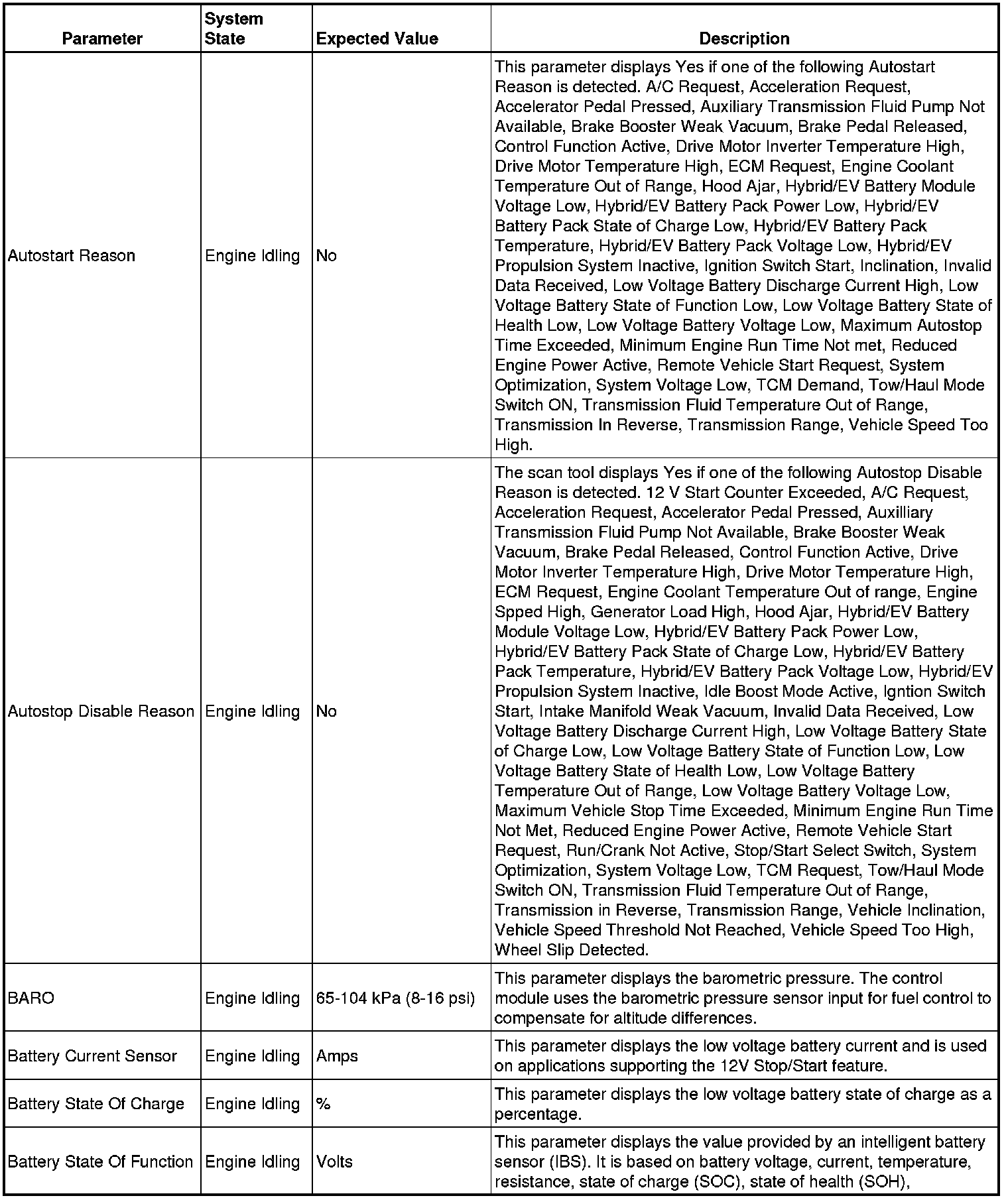 Only the parameters listed below are referenced in this service manual for use in diagnosis.