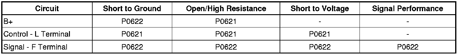 The engine control module (ECM) uses the generator field duty cycle signal circuit, or F-terminal circuit, to monitor the duty cycle of the generator. The generator field duty cycle signal circuit connects to high side of the field windings in the generator. A pulse width modulated (PWM) high side driver in the voltage regulator turns the field windings on and off. The ECM uses the PWM signal input to determine the generator load on the engine. This allows the ECM to adjust the idle speed to compensate for high electrical loads. The ECM monitors the status of the generator field duty cycle signal circuit. When the ignition is ON and the engine is off, the ECM should detect a duty cycle near 0%. When the engine is running, the duty cycle should be between 5-99%.